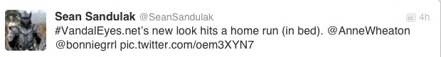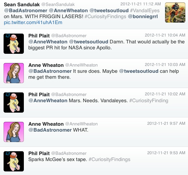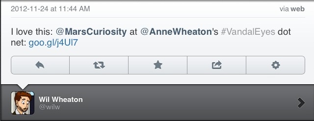 And do you know who saw it and liked it? Bobak Ferdowsi, who just happens to be the Flight Director for the Mars Curiosity Rover. You know…the guy with the mohawk. And then Wil Wheaton said he liked it on Twitter. Unfortunately, that does not count as an official retWheaten™ because it links to the VandalEyes site and not the original tweet.