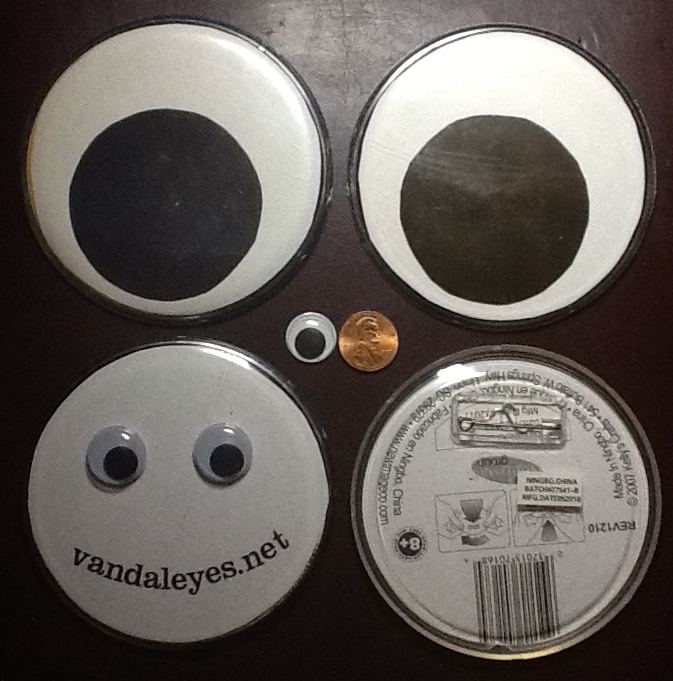 Also in other VandalEyes news, you can make giant googly eyes with button blanks available at any good crafting store. Just cutout two circles and snap them inside. Penny shown for scale.